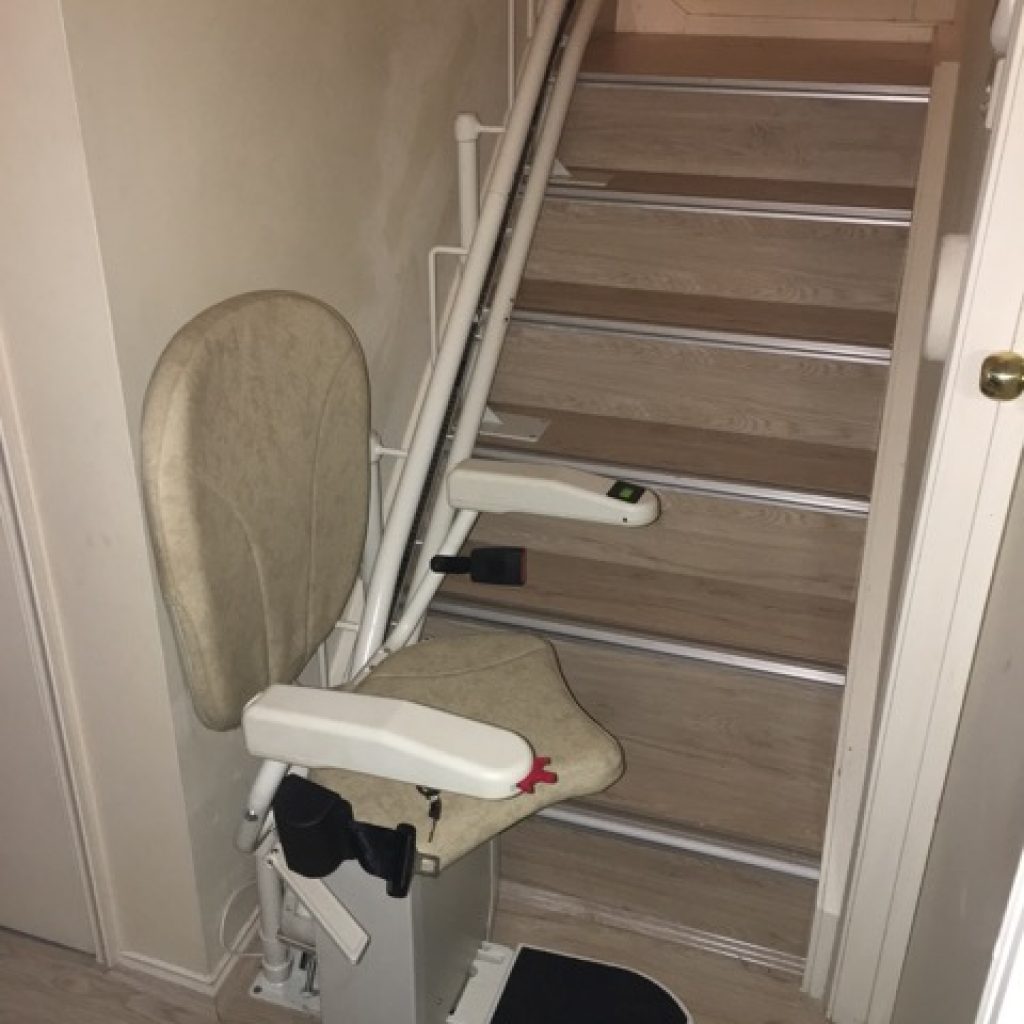 At the bottom of the stairs the ‘drop-nose’ rail, at just a little over 300mm from the 1st riser, ensured that there was no obstruction past the wall in the main living area. The Ergo Plus seat added leg-room in a fairly tight staircase. See how the rail fits close to the wall and tight around the 180 degree bend.